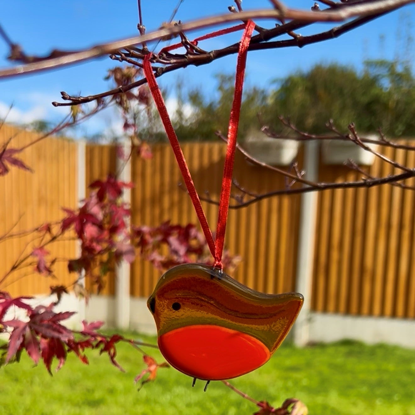 This fused glass robin is one of my best-selling designs and it’s easy to see why. With its glowing red breast and rich amber tones, it captures the warmth and character of Britain’s favourite garden bird. When the light shines through the glass, the colours come alive, creating a cheerful focal point that brings a little joy all year round.